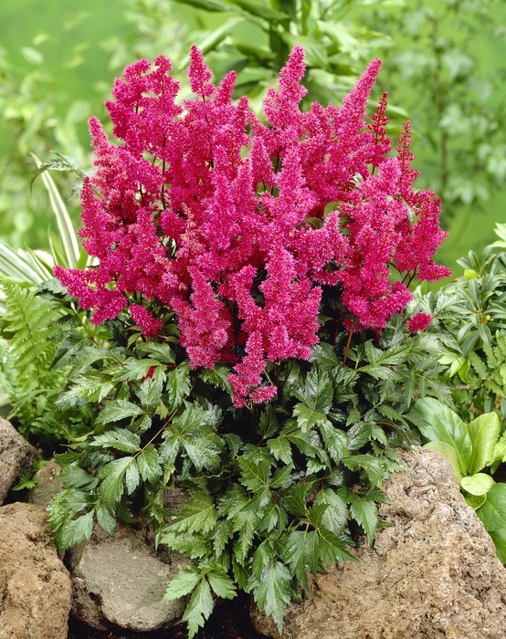 Саженцы астильбы Köln относятся к разряду самых неприхотливых и при этом очень красивых декоративных сортов. Этот густой куст с темно-зелеными листьями является очень компактным, а когда в июле появятся карминово-красные метелки, астильба становиться более пышной и раскидистой. Саженцы этого сорта могут успешно развиваться в местности с высоким уровнем грунтовых вод, так что застой воды для них совершенно нестрашен. Чего не скажешь о засухе. Размещайте эту астильбу в полутени – так она будет расти лучше всего.