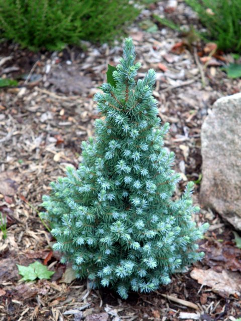 Ель канадская Блю Вондер "Blue Wonder" - медленнорастущая карликовая декоративная форма высотой не более 1,8 метра и диаметром 0,8 метра. К 10 годам достигает высоты 70 см и диаметра кроны 40 см. Имеет конусовидную, плотную крону и оригинальную серо-синюю окраску хвои. Ее иглы не приобретают со временем зеленую окраску. Весной появляется молодая немного более светлая хвоя, к середине лета цвет которой сливается с цветом старой хвои. Корневая система поверхностная.
