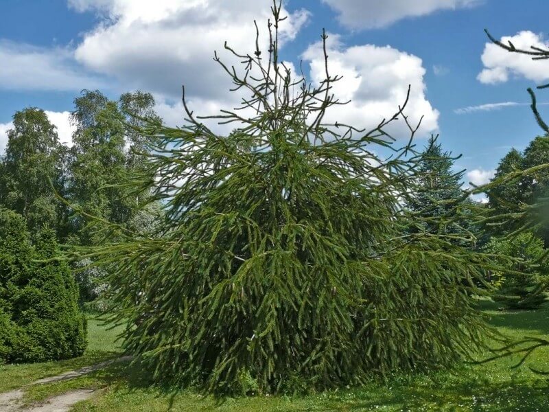 Ель обыкновенная Virgata - очень декоративный сорт. Высота дерева до 6-8 м, диаметр 3-4 м в 15 лет. Форма кроны конусовидная,ветви длинные, касаются земли, слаборазвлетвленные, змеевидные, горизонтальные и свисающие вниз, в верхней части вертикальные. Растение быстро растущее, годовой прирост до 40 см. Почки расположены на концах побегов. Хвоя толстая, заостренная, темно–зеленая, до 2 см длиной. Молодые весенние приросты светло-зеленые. Эта ель теневынослива, но лучше развивается на освещенных местах.