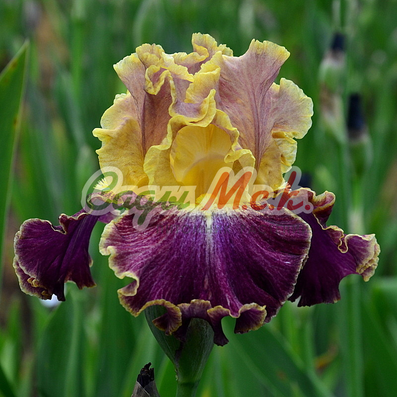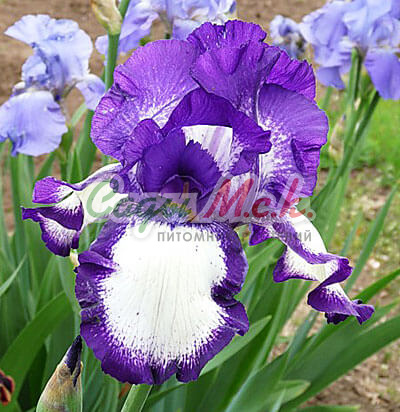 Рассада ириса Acoma относится к высоким бородатым ирисам, известным как пликата, т.е. в которых яркий рисунок располагается на более светлом фоне. Это однократно цветущий ирис, на каждом стебле которого развивается от 5 до 6 бутонов. Нижние доли (фолы) имеют светлый фон цвета слоновой кости и фиолетовые края, мягко переходящие друг в друга. Верхние доли (стандарты) – светло-светло-голубые, вертикально подняты вверх. Бородка – желтая, малозаметная. Верхние и нижние доли слегка гофрированные. Цветение среднее.