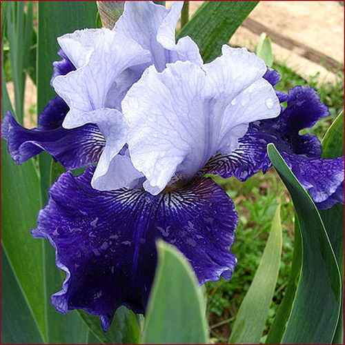 Ирис World Premier порадует вас льдисто-белыми стандартами и таким же ободком на сине-пурпурных фолах. Высота цветоноса 92 см.