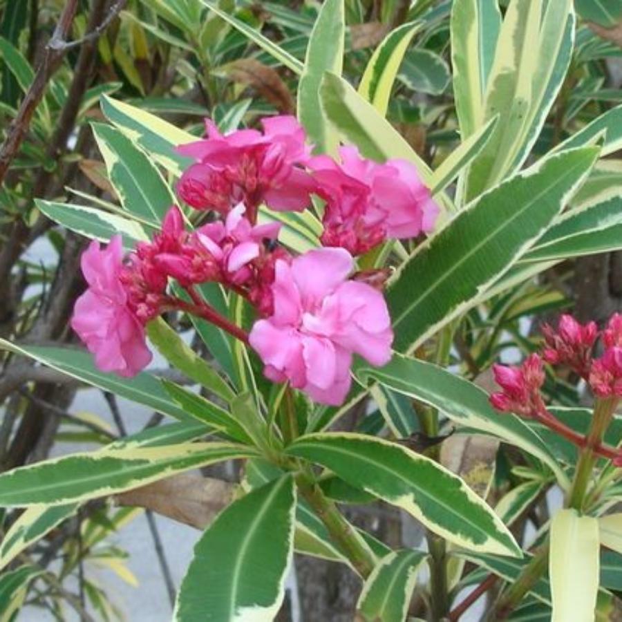 Олеандр обыкновенный Вариегата (лат. Nerium oleander Variegata) - необычный и очень красивый сорт. Листья эллиптические, заостренные, зеленого окраса с толстой кремовой окантовкой. Цветки маленькие но махровые, розовые от светлых то красных оттенков, ароматные. Растение любит солнце, цветет летом. Внимание! Олеандр - ядовитое растение, поэтому при его культивировании требуется осторожность.