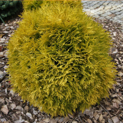Туя западная Amber Glow - карликовый шаровидный хвойный кустарник с золотистой хвоей. Высота растения не превышает 0,9 см в высоту и диаметре. В 10 лет высота не превышает 0,6м. Растет медленно. Хвоя золотисто-желтая, к зиме янтарно-желтая. Сорт предпочитает солнечные места, умеренно влажные, хорошо дренированные почвы.