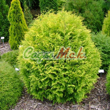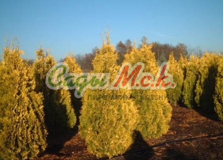 Узкая острая желто-хвойная туя высотой до 10 м. и диаметром кроны до 1,8 м. Дерево растет довольно быстро, ежегодно прибавляя до 30 см высоты. Имеет прямой, ровный и стройный ствол, к которому плотно прижимаются скелетные ветви, образуя красивую устремленную вверх общую форму дерева.Скелетные ветки короткие и мощные, тесно прижимаются друг к другу, а на концах начинают сильно ветвиться. За счет такого строение крона выглядит очень густой и плотной, формируется симметрично. Хвоя густая, яркая, золотисто-жёлтая, не подгорает на солнце, зимой приобретает бронзовый оттенок. Хорошо себя чувствует как на солнце, так и в полутени. На солнце не горит.<br>